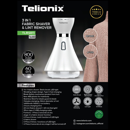 پرزگیر کد 5811 تلیونیکس، دستگاهی کاربردی برای از بین بردن پرز، مو و ذرات ریز از لباس، مبلمان و سطوح مختلف است. این دستگاه دارای باتری لیتیومی با شارژدهی تا 60 دقیقه بوده و از طریق پورت USB Type C شارژ میشود. طراحی ارگونومیک و سبک آن کاربری راحت و آسان را فراهم میکند.